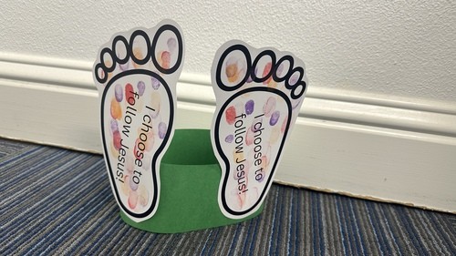 Who were Jesus’ first followers? (Andrew, Simon Peter, Philip, and Nathanael) Jesus chose disciples to follow Him. Jesus wants you to follow Him too! Jesus died on the cross and rose again to save us from our sins so we can follow Him. Everyone who follows Jesus is His disciple. When you see these feet, they can remind you that you can follow Jesus and be His disciple.
