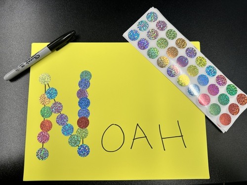 Place construction paper and dot stickers on the table. Write a child’s name across the paper with a marker making the first letter large. Encourage the child to outline the first letter of their name by placing dot stickers over the letters.