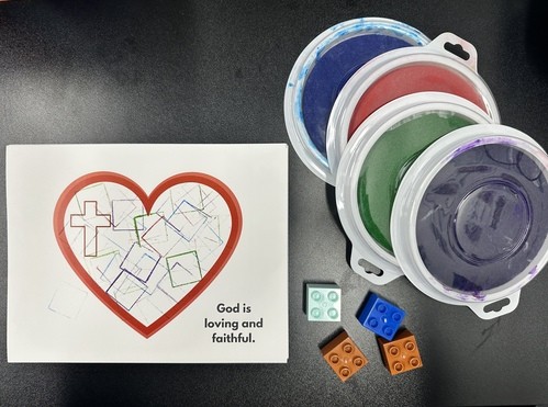 Show the kids how to use the duplo blocks as “stamps” to stamp their heart. (You will have plenty of baby wipes to clean up the kids and table with. Just throw the dirty blocks in the ziplock bag when you are done, I will wash them).