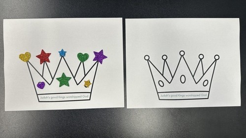 For our craft we placed jewels on a crown. Who wears crowns? [Allow responses.] Yes! Kings wear crowns. Judah was ruled by kings. Today we are learning about Judah’s good kings. Our crowns say “Judah’s good kings worshiped God.” Can you say that? These kings helped the people of Judah know what was right. The good kings of Judah led the people to worship God and follow Him.