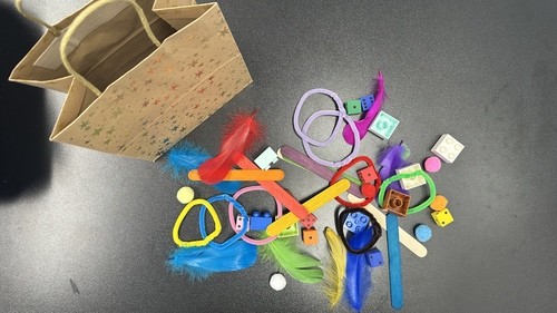 Have the kids sit in a circle. Dump out the bag in front of them. Tell the kids that first we need to make piles of all the different objects. A pile of feathers, a pile of pompoms, a pile of sticks, etc.  Have the kids sort the objects into different piles. (Note the objects are sorted by type not by color). Once the kids have made all the different piles, begin counting one pile at a time.  Act surprised that each group comes out to 8 items.