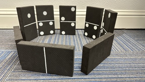 Guide the kids to work together or individually to build walls using the giant dominos. You can use the people figures to put inside the walls. Allow them to gently knock down the walls.