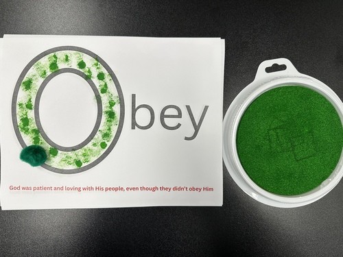 You put stickers on the letter O. The word obey begins with O. It is always important to listen and obey. In today’s Bible story, we learned that the people of Judah did not want to listen and kept disobeying God. He sent good kings and prophets with messages from God to help them. But the people did not listen. The people were taken from their land because of their disobedience. Sin must be punished. The good news is that Jesus took the punishment for our sins when He died for us. Jesus came back to life, showing that if we trust in Him, all our sins are forgiven.