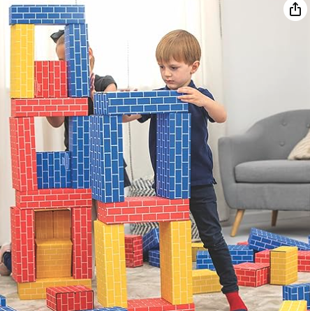 Guide the kids to build walls using the giant cardboard blocks. Each time the wall is knocked down, work together to build it back up. You may want to make space in between kids so they can knock down the walls and no one will get “hurt”.